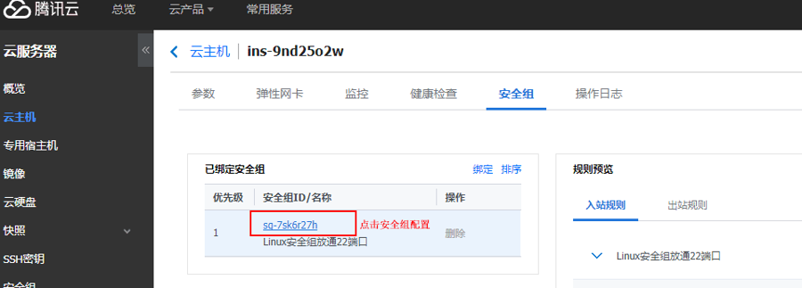 腾讯控制台-云服务器,点击主机ID链接,进入云服务器详细信息,然后点击已经绑定的安全组名称