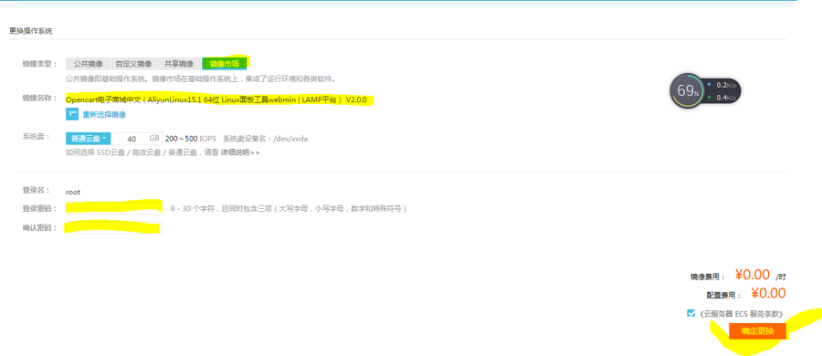 3、选择“服务市场”中的“公共镜像”或其他选项,找到您要使用的镜像,设置好您的用户密码,就可以开始重装了。