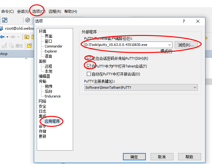 打开Winscp-选项-集成-应用程序。Putty/terminal客户端路径这里为你本地putty.exe程序的路径