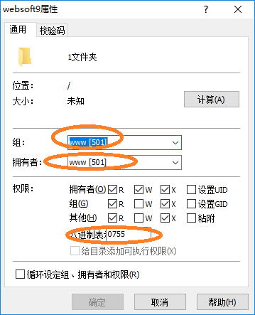 循环设定组、拥有者和权限建议打钩,这样当前文件夹以下的目录都会生效