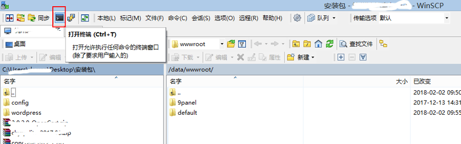 WinSCP登录到服务器,点击菜单来的命令窗口图标(快捷键Ctrl+T也可以)