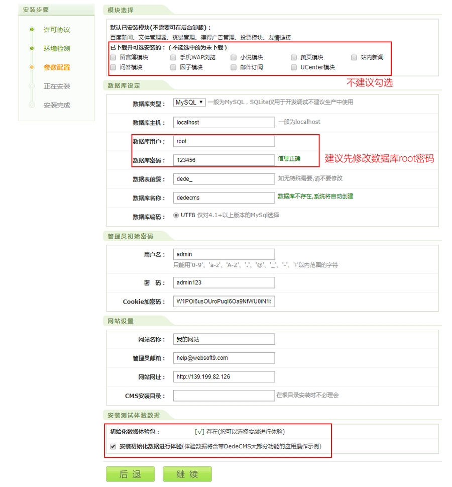 完成通过许可协议、环境检测之后,进入配置数据库界面(默认数据库为:dedecms,默认用户名和密码参考本文档”常用账号与密码说明“章节),并设置的管理员帐号密码,然后继续