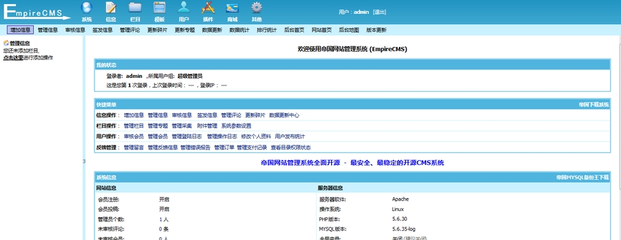 恭喜成功安装帝国网站,点击 “进入后台控制面案”(请记住管理地址。为确保服务器安全,可以远程登录后台服务器,将e/install目录删除);