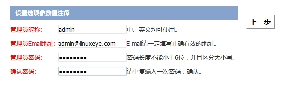 数据库连接正确,点击“下一步”后进入填写管理员信息,牢记之,并进入下一步