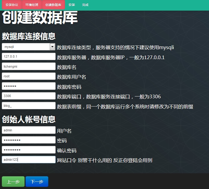 填写数据库信息(数据库名默认为lcm,数据库账号为root,数据库密码是123456或您修改后的密码)和后台账号信息