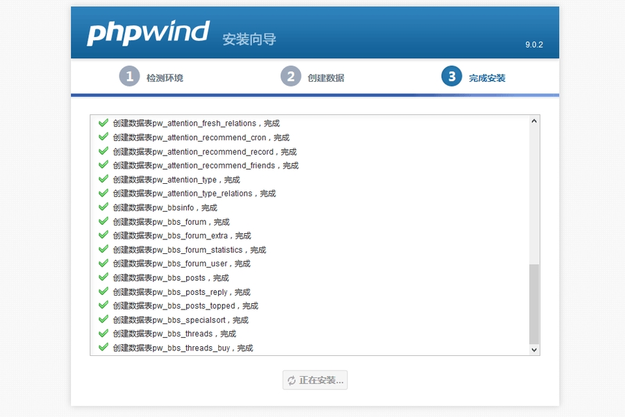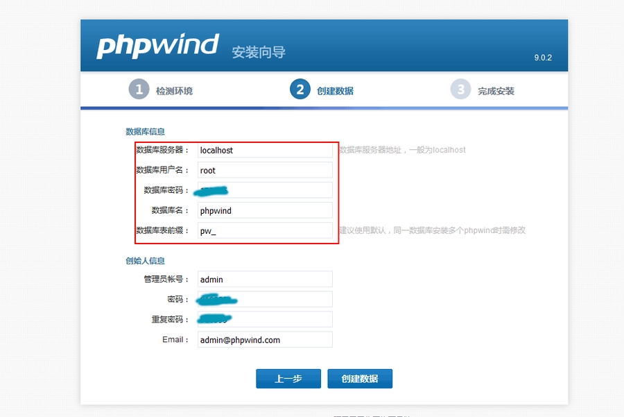 进入配置数据库和设置管理员账号界面(默认数据库为:phpwind,默认用户名和密码参考本文档”常用账号与密码说明“章节)