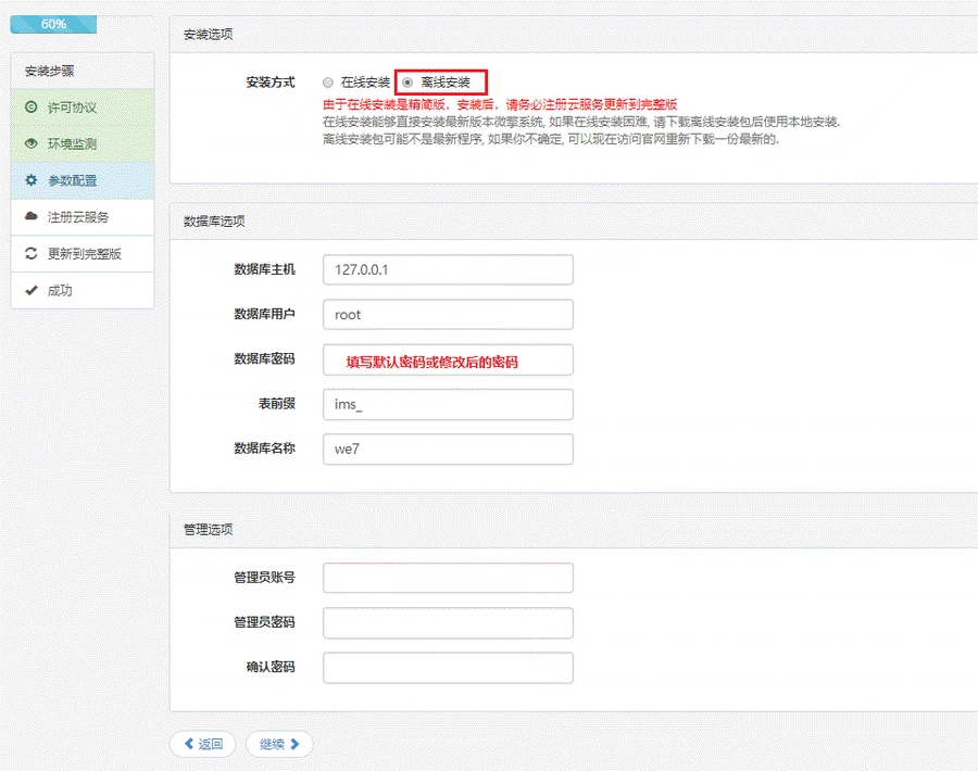 ,并填写管理员信息,牢记之,点击“继续”进入安装,