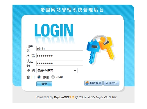 恭喜成功安装帝国网站,点击 “进入后台控制面案”(请记住管理地址。为确保服务器安全,可以远程登录后台服务器,将e/install目录删除);