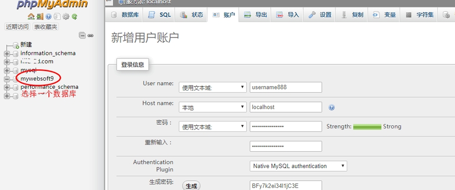 登录PhpMyAdmin后,点击左侧菜单栏中新打算对其新增用户的数据库(例如:mywebsoft9)