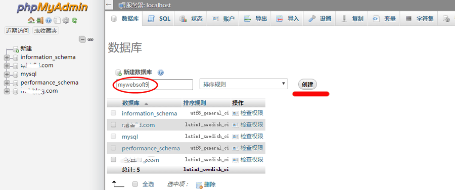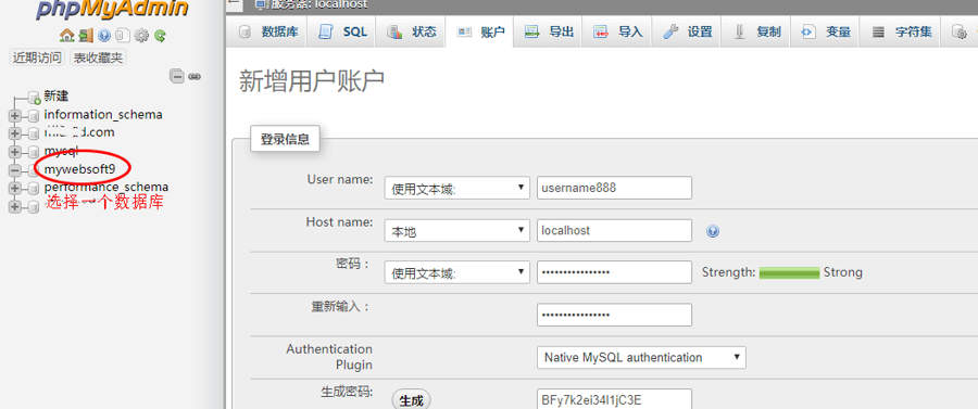 登录PhpMyAdmin后,点击左侧菜单栏中新打算对其新增用户的数据库(例如:mywebsoft9)