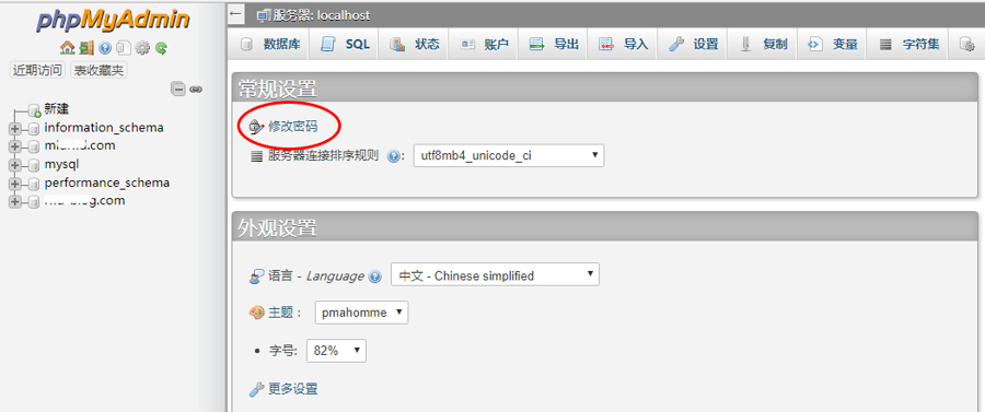 登录PhpMyAdmin后,默认页面-常规设置,点击“修改密码”