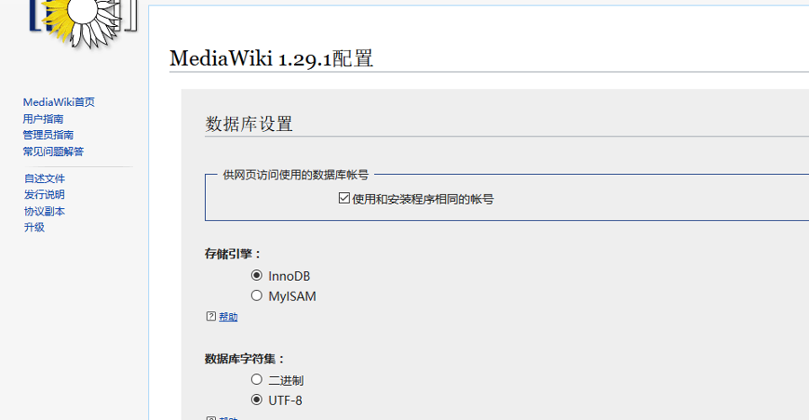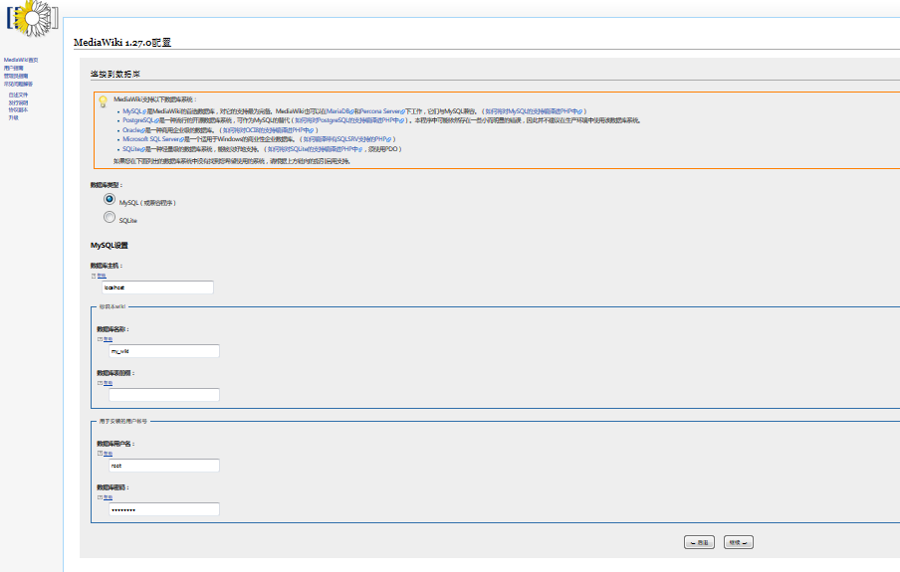 填写您的数据库参数(默认数据库为:mediawiki,默认用户名和密码参考本文档”常用账号与密码说明“章节),保存并继续;