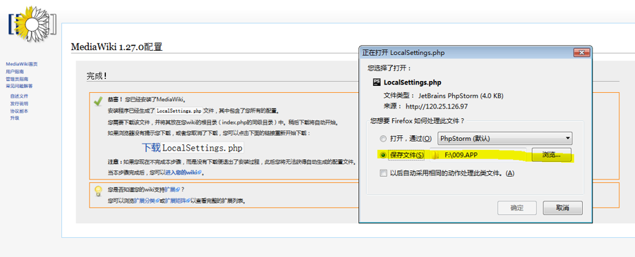 配置完成后会生成LocalSettings.php文件,根据提示下载后并保存至mediawiki根目录(index.php的同级目录)即可。至此,安装完成。