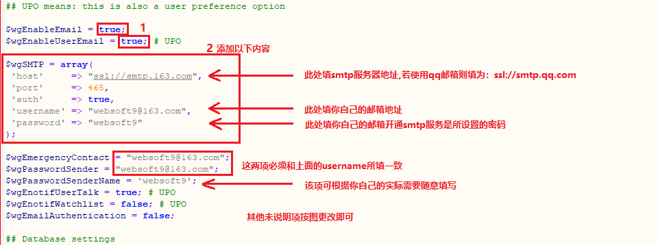在$wgEnableEmail = true;、$wgEnableUserEmail = true;后添加如下图所示的内容,用来设置邮件服务器地址、端口、发送人的用户名和密码等;