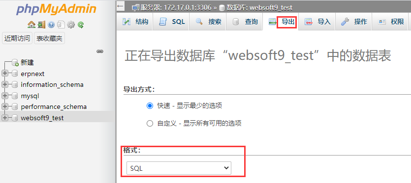 左侧菜单中选择所需的数据库,顶部导航栏上选择“导出”标签
