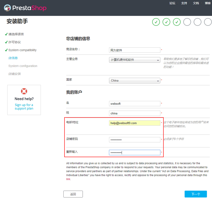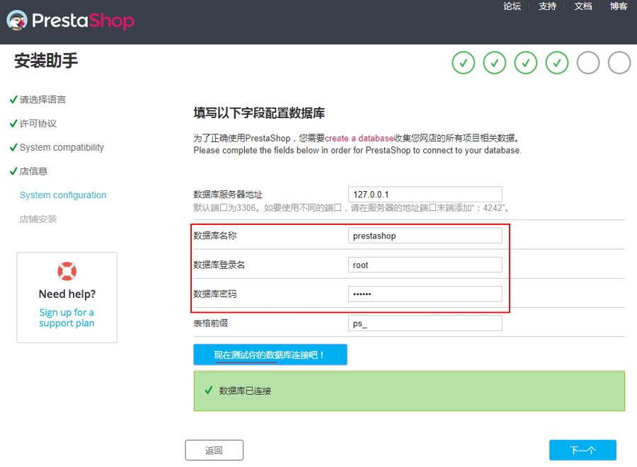 安装进入数据库配置界面(默认数据库为:prestashop,默认用户名和密码参考本文档”常用账号与密码说明“章节),然后点击”保存”