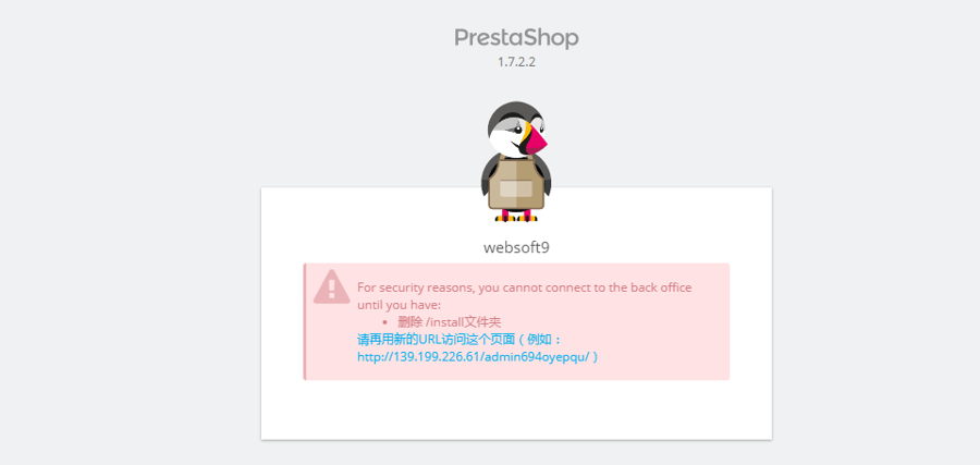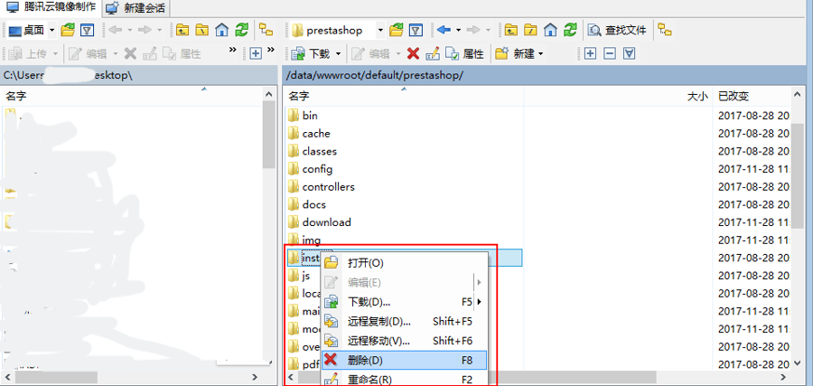 使用WinSCP登录到服务器,进入/data/wwwroot/default/prestashop,删除install文件夹