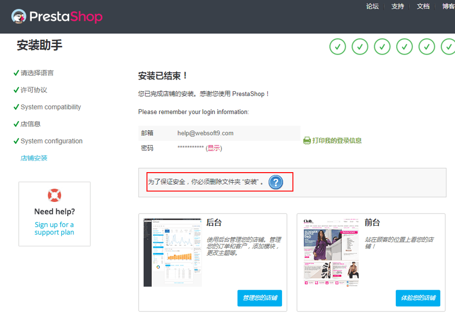 删除完成后,点击第六步的后台链接,开始体验后台(请牢记后台地址)