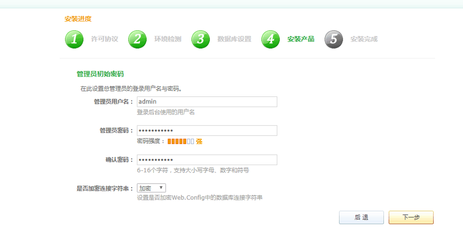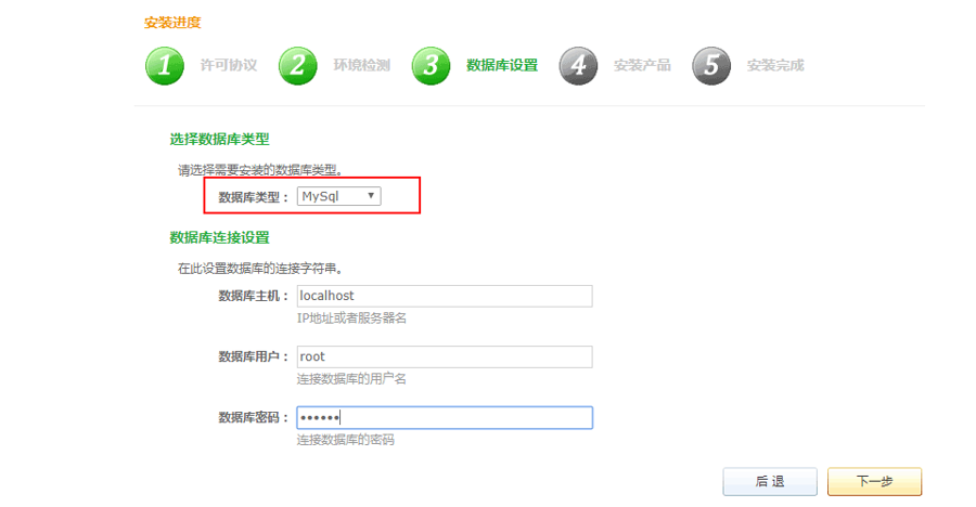 完成通过许可协议、环境检测之后,进入配置数据库界面。选择MySQL,填写数据库账号(默认用户名和密码参考本文档”常用账号与密码说明“章节),然后进入下一步