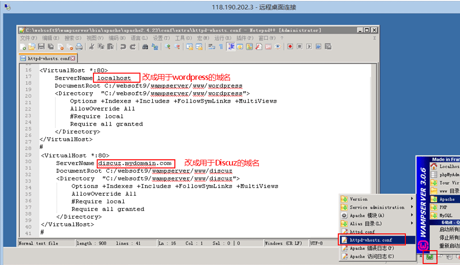 远程到Windows服务器,进行域名配置文件http-vhosts.conf修改,然后重启服务