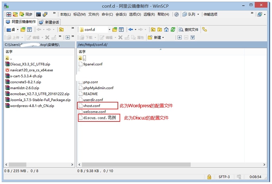 通过WinSCP远程到Linux服务器,进入/etc/httpd/conf.d目录,准备修改域名的配置文件。