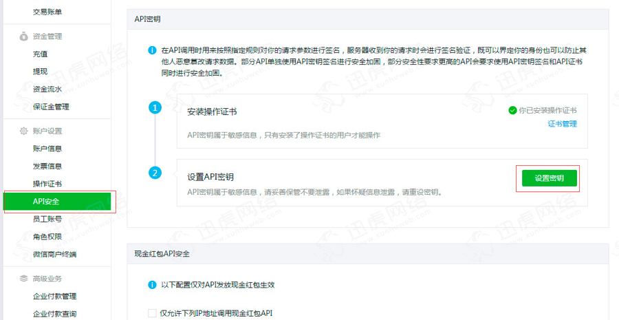 2)获取微信支付密钥登录微信支付商户平台(https://pay.weixin.qq.com),在账户设置-API安全中找到并设置密钥,密钥为32位,注意一下,获取密钥后保留备用