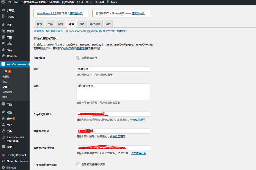 配置微信支付插件在woocommerce设置,支付设置中找到微信支付设置,填入微信公众号appid和微信支付密钥