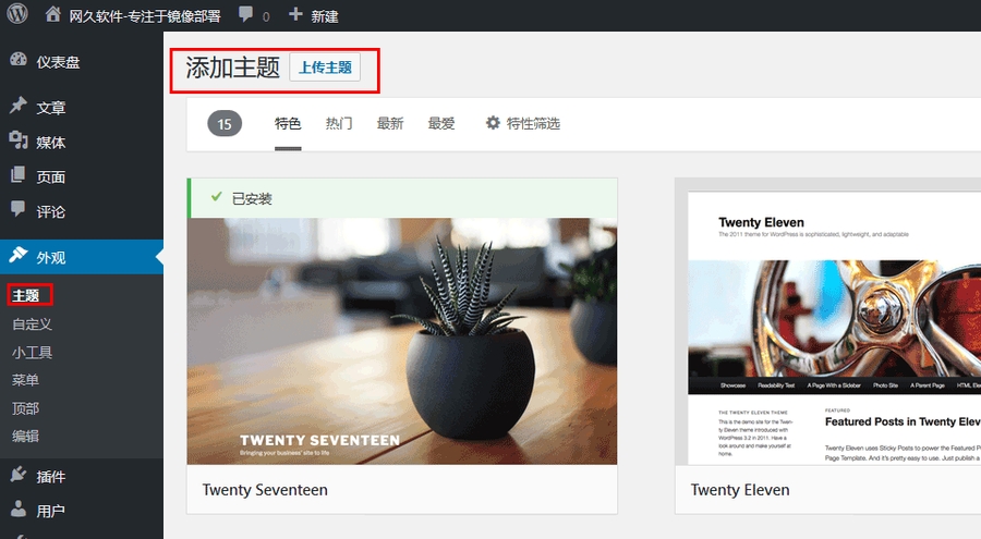 通过WordPress后台-外观-主题-添加,后台上传主题安装