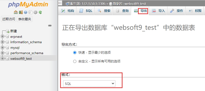 左侧菜单中选择所需的数据库,顶部导航栏上选择“导出”标签