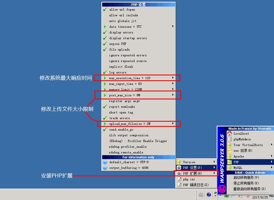 Windows镜像安装了WAMPserver,它提供一个可视化的运行管理器,通过鼠标左键单击Windows任务栏右侧“W图标”进入管理界面,您可以参考下图做常见的配置: